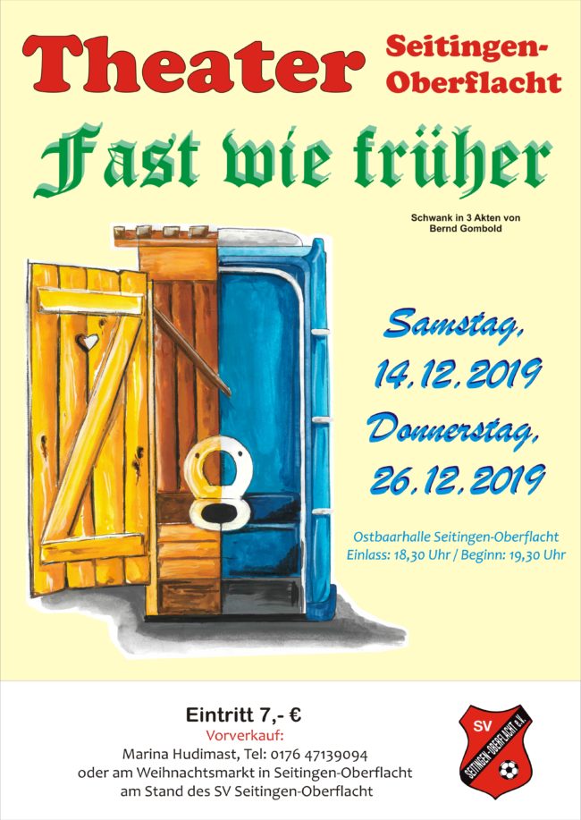 Es heißt wieder Theaterzeit beim SVSO…Am 14.12. und 26.12. finden die diesjährigen Vorstellungen in der Ostbaarhalle statt. Also sichert euch eure Karte und stellt euch auf einen geselligen und lustigen Abend ein…Wir freuen uns auf Euch